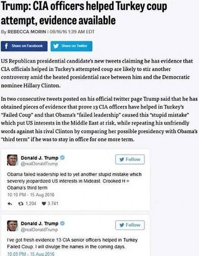 Resmi twitter hesabından "13 CIA yetkilisi darbeye yardım etti" paylaşımında bulunan Trump'ın, daha sonra bu paylaşımı sildiği anlaşıldı. Daily Iowan muhabiri Rebecca Morin'in, Trump'ın tweetlerini haberleştirdiği yazı da bir süre sonra yayından kaldırıldı.