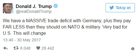 Her zaman olduğu gibi Twitter’daki kişisel hesabından bir mesaj yayınlayan Trump, ABD’nin, Almanya ile çok büyük bir ticaret açığı olduğunu söyledi. Almanya’nın NATO için yaptığı harcamaları da az bulduğunu tekrarlayan Trump,“Almanya ile DEVASA bir ticaret açığımız var artı NATO için gerekenden DAHA AZ ödüyorlar. Bu ABD için çok kötü. Bu durum değişecek” ifadelerini kullandı.