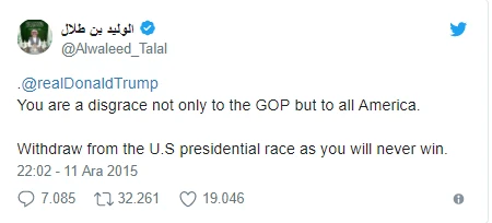 Tweette Trump, "Sersem Prens Tallal, bizim Amerika Birleşik Devletleri politikacılarını babasının parasıyla kontrol etmek istiyor. Seçildiğim zaman bunu yapamazsın." ifadelerini kullanmıştı.