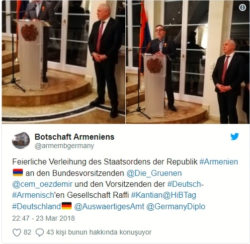 Almanya'da Yeşiller Partisi Milletvekili Cem Özdemir'e Ermenistan tarafından Devlet Liyakat Nişanı verildiği belirtildi.