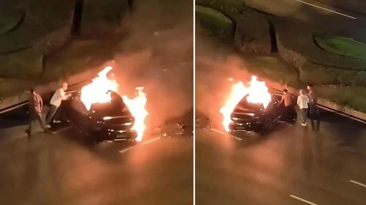 Bir kişi sürücüyü araçtan çıkarabilmek için yumruklarıyla camları kırmaya çalışsa da başaramadı. Kısa süre sonra olay yerine itfaiye geldi.