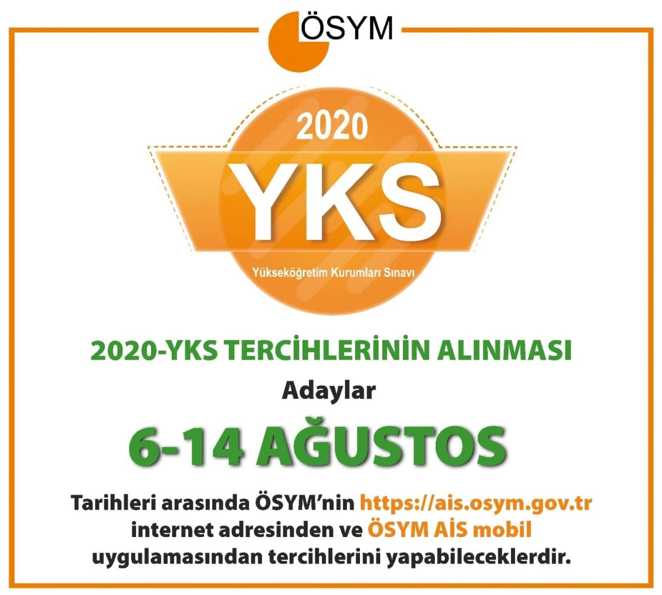 ÖSYM Başkanı Prof. Dr. Halis Aygün, sosyal medya hesabı üzerinden, “ Değerli YKS adaylarımız, 2020-YKS tercih işlemleri bugün başlıyor. Tercihlerinizi 6-14 Ağustos 2020 tarihleri arasında https://ais.osym.gov.tr sayfamızdan ve ÖSYM AİS mobil uygulamamızdan yapabilirsiniz. Yapacağınız tercihlerin sizlere ve ailelerinize hayırlı olmasını dilerim” notuyla yaptığı paylaşımla 2020-YKS tercih işlemlerinin bugün başladığını ve tercihlerin 6-14 Ağustos 2020 tarihleri arasında “ais.osym.gov.tr” sayfasından ve ÖSYM AİS mobil uygulamasından yapılabileceğini bildirdi.