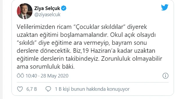 "Velilerimizden ricam 'Çocuklar sıkıldılar' diyerek uzaktan eğitimi boşlamamalarıdır. Okul açık olsaydı 'sıkıldı' diye eğitime ara vermeyip, bayram sonu derslere dönecektik. Biz,19 Haziran’a kadar uzaktan eğitimle derslerin takibindeyiz. Zorunluluk olmayabilir ama sorumluluk bâki."