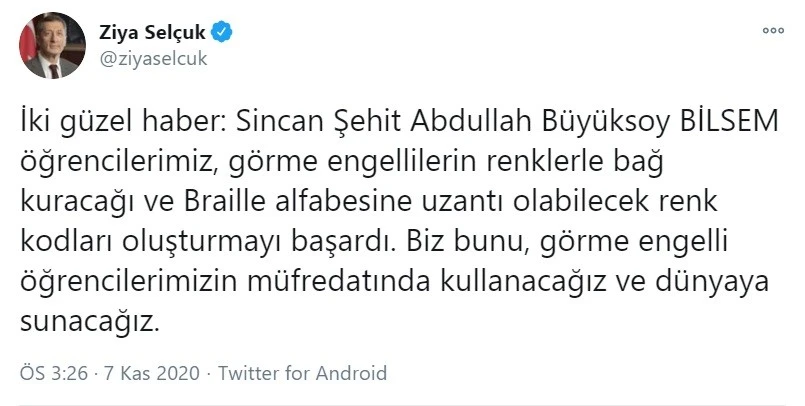 "İki güzel haber: Sincan Şehit Abdullah Büyüksoy BİLSEM öğrencilerimiz, görme engellilerin renklerle bağ kuracağı ve Braille alfabesine uzantı olabilecek renk kodları oluşturmayı başardı. Biz bunu, görme engelli öğrencilerimizin müfredatında kullanacağız ve dünyaya sunacağız."