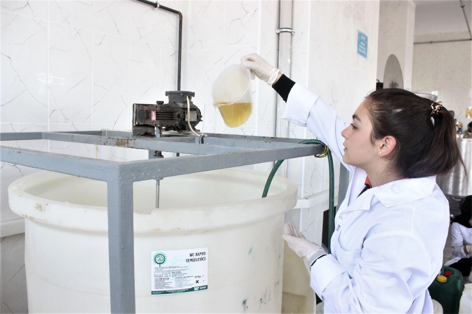 Öğrencilerin işi okulda öğrendiğini ifade eden Kimya Teknolojileri Alan Şefi İhsan Erarslan, “Okulumuz küçük bir fabrika gibi. Günlük 2 ton kapasitemiz var. Sıvı sabun, çamaşır suyu, camsil, yüzey temizleyici, leke çıkartıcı ve bulaşık deterjanı üretimi yapıyoruz. Burada eğitim gören öğrenciler mezun olduktan sonra sanayinin her hangi bir yerinde rahatlıkla iş imkanı bulabiliyor. Burada eğitim gören öğrenciler hem işi öğreniyor, hem de kazanılan paradan ücret alıyor. Öğrenciler ton başına 250 lira ücret alıyor” dedi.