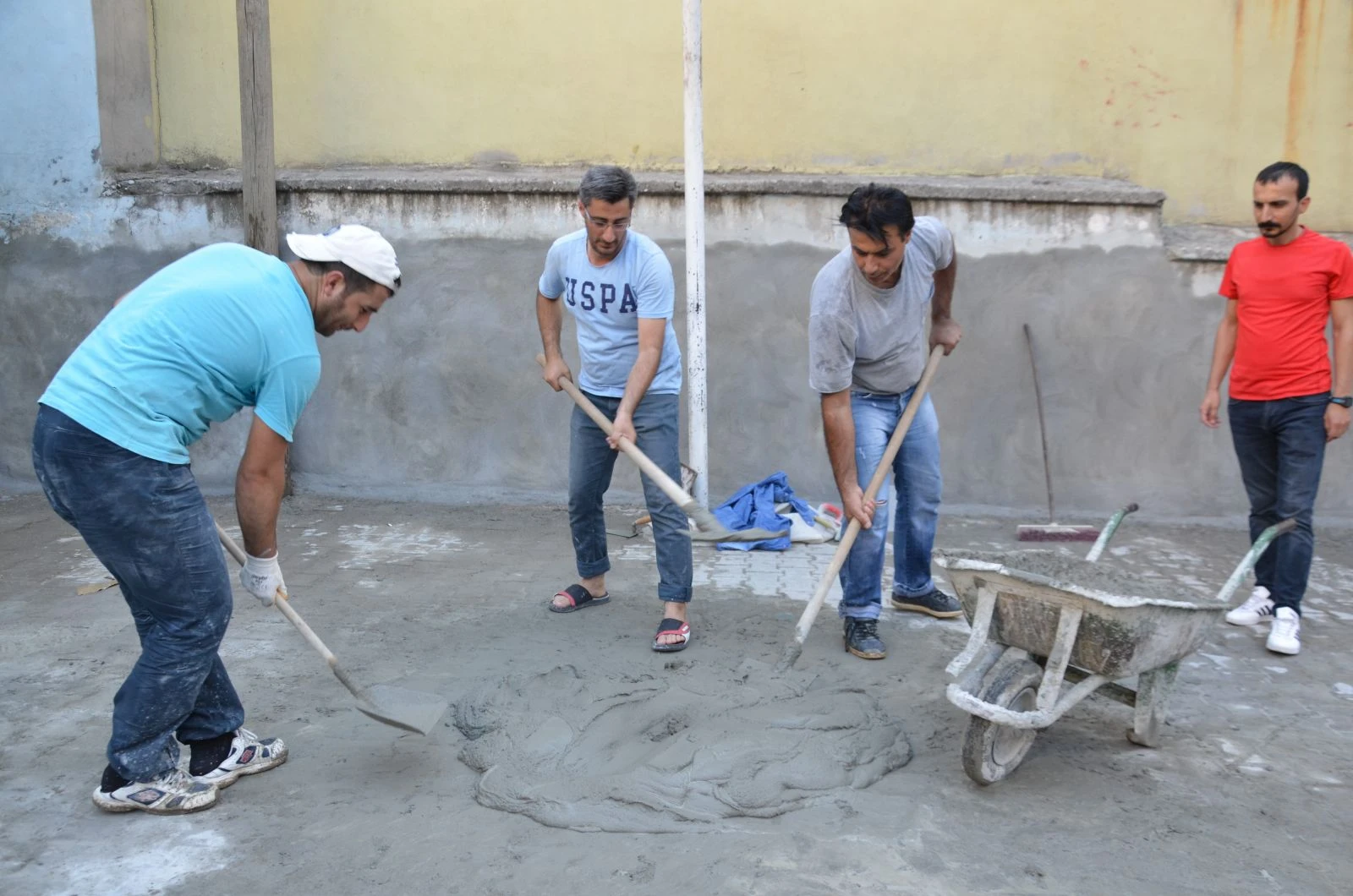 Sorunları belirleyen öğretmenler, daha sonra aldıkları malzemelerle işe koyuldu. Çimento harcı yapıp duvarları sıvayan, iskeleye çıkıp kum taşıyan öğretmenlerin fedakar davranışı vatandaşların takdirini topladı.