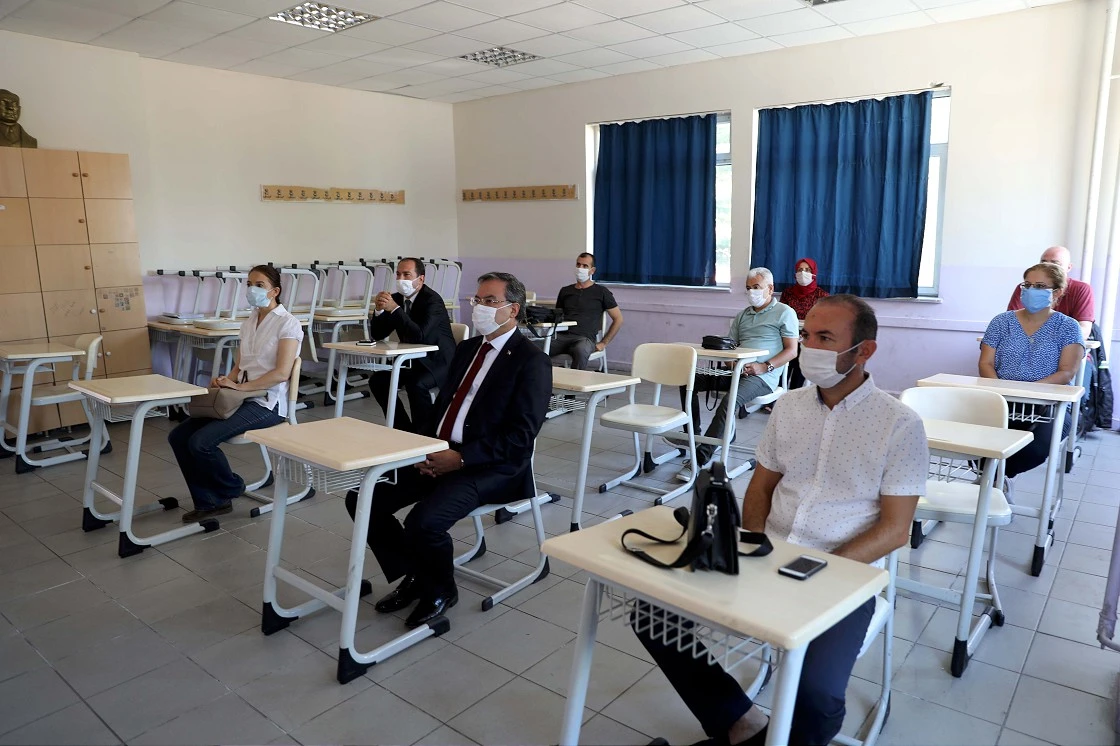 Öğretmenler okulun toplantı salonunda Milli Eğitim Bakanı Ziya Selçuk'un konuşmasının ardından salgına karşı koruyucu ve önleyici tedbirler ile okulda uyulması gereken kurallar hakkında bilgilendirildi.