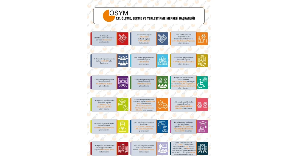 ÖSYM, 2019 yılına dair sınav verilerini açıkladı. Söz konusu verilerde yer alan rakamla ise görsel hazırlanarak kamuoyuyla paylaşıldı. 2019 yılında ÖSYM’nin sınav takviminde yer alan 47 sınav uygulandı. Bu sınavlarda kullanılan toplam 179 testte, 9 bin 276 adet soru kullanıldı. Söz konusu soruların oluşturulması ve denetlenmesi sürecinde ise; 2 bin 914 akademisyen ve öğretmen aktif görev aldı.