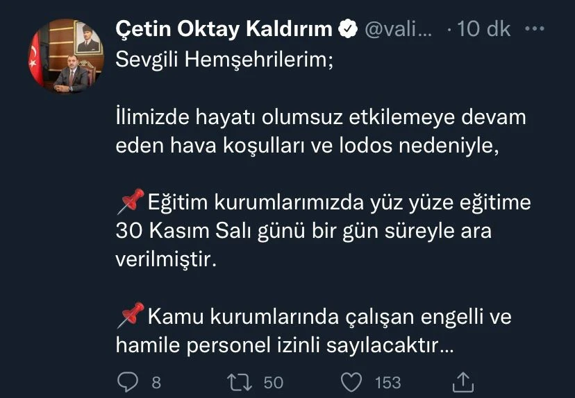Hemşehrilerimizin, öğretmen ve öğrencilerimizin mağduriyet yaşamaması için resmi-özel tüm okullar, halk eğitim merkezleri, özel öğretim kursları, motorlu taşıt sürücü kursları, özel eğitim ve rehabilitasyon merkezlerimiz, resmi okullardaki destekleme ve yetiştirme kurslarımız ile özel okullardaki takviye kurslarımız da dahil olmak üzere bütün eğitim kurumlarında 30 Kasım 2021 Salı günü, bir günlük ara verilmesi uygun görülmüştür. Kamu kurum ve kuruluşlarında çalışan malul ve engellilerimiz, hamile personelimiz de ayrıca bir talimat veya talebe gerek kalmaksızın bir gün süreyle idari izinli sayılacaklardır.