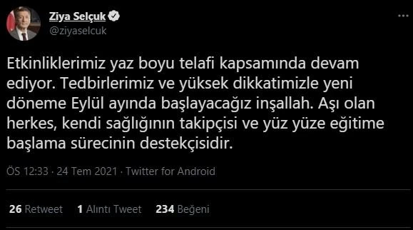 Milli Eğitim Bakanı Ziya Selçuk, okulların açılma sürecine ilişkin paylaşımda bulundu. Bakan Selçuk, yaptığı yeni açıklamada etkinliklerin yaz boyu devam ettiğini hatırlatarak, “Tedbirlerimiz ve yüksek dikkatimizle yeni döneme Eylül ayında başlayacağız inşallah. Aşı olan herkes, kendi sağlığının takipçisi ve yüz yüze eğitime başlama sürecinin destekçisidir.” ifadelerini kullandı.