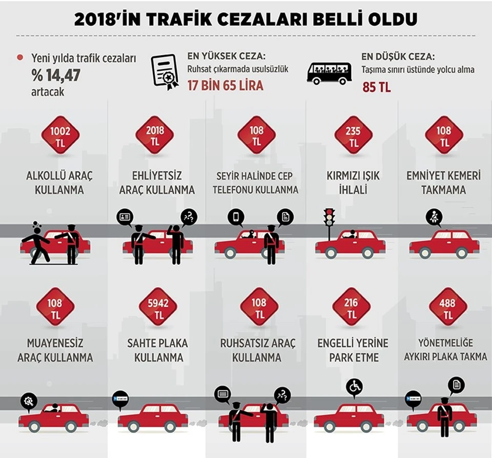 2018'de muayene istasyonları işletme şartlarına uymaz ya da gerektiği şekilde araçları muayene etmezse ilkinde 8 bin, ikincisinde 13 bin 344 ve üçüncüsünde 26 bin 692 lira para cezası ödeyecek.Sürücü belgesiz araç kullanmanın cezası 2 bin 18 lira olacak, kırmızı ışık kuralına uymayanlara 235 lira ceza kesilecek.Bulundurması zorunlu olduğu halde aracında emniyet kemeri bulundurmayan veya kullanmayanlar ile motosiklet, motorlu bisiklet ve elektrikli bisikleti kasksız ve gözlüksüz kullananlara 108'er lira ceza verilecek.