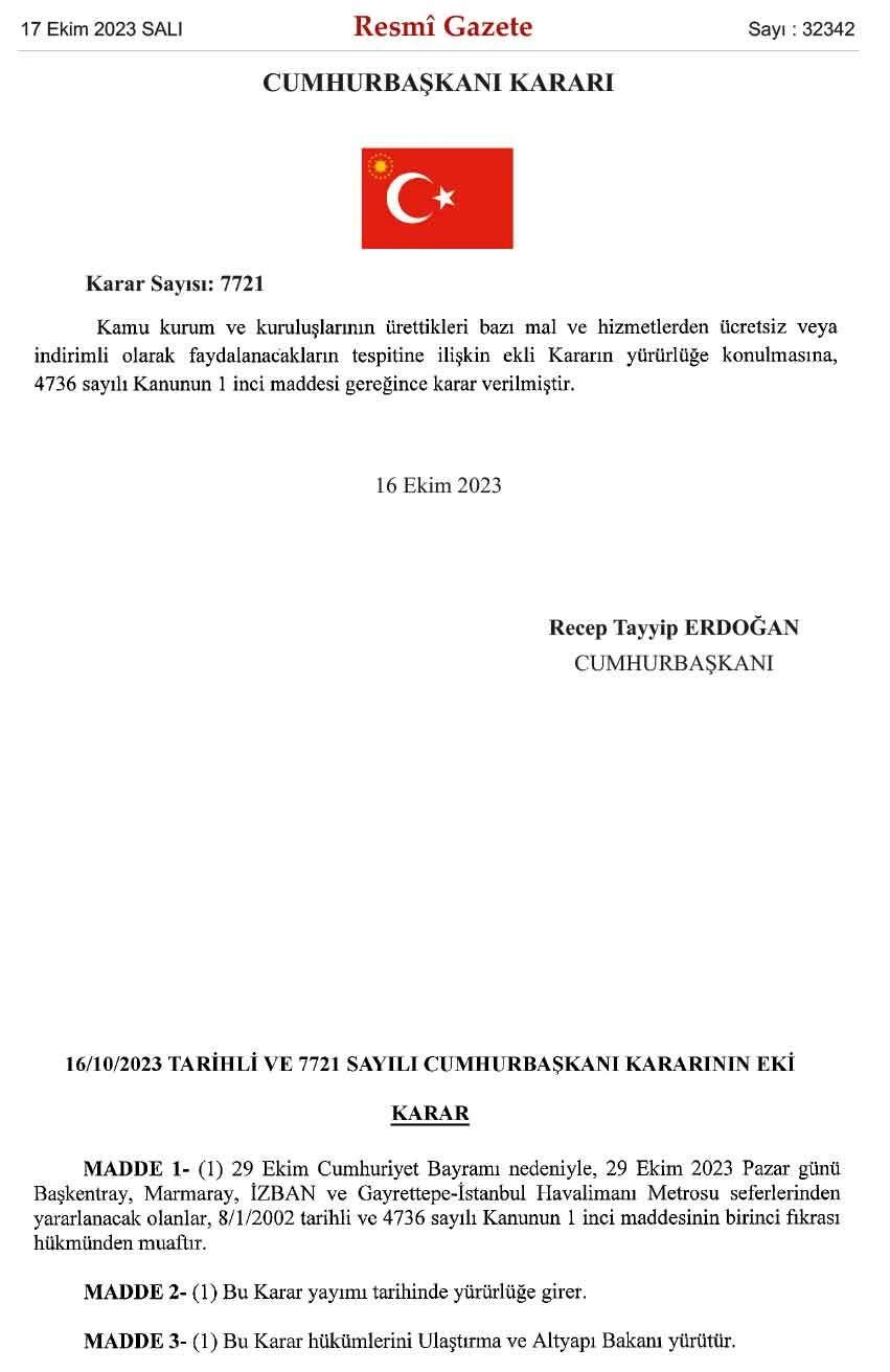 Karara göre, Türkiye Cumhuriyeti'nin 100'üncü kuruluş yıl dönümü kutlama etkinlikleri kapsamında İstanbul, Ankara ve İzmir'de raylı sistemle yapılan toplu taşıma hizmetleri ücretsiz sağlanacak.