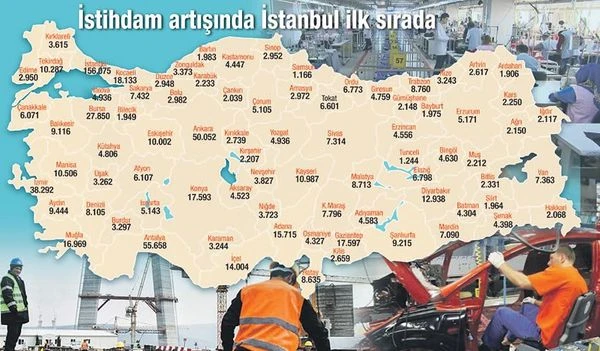 Çalışma ve Sosyal Güvenlik Bakanı Mehmet Müezzinoğlu'nun, SABAH'a açıkladığı 81 ilde istihdam dağılımının ayrıntılarına göre İstanbul 156 bin 75 kişiyle listede ilk sırada yer aldı. Antalya 55 bin 658 ile ikinci, Ankara 50 bin 51 ile üçüncü oldu. Türkiye sanayisinin kalbi sayılan Bursa'da 27 bin 980, Kocaeli'nde 18 bin 133 kişiye istihdam sağlandı. Toplam istihdam artışının yüzde 20'si İstanbul'da gerçekleşti. Diyarbakır 13 bine yaklaşan istihdam artışı ile dikkat çekerken, Gaziantep 17 bin 597, İzmir 38 bin 292, Konya 17 bin 593, İçel 14 bin yeni istihdam sağladı.