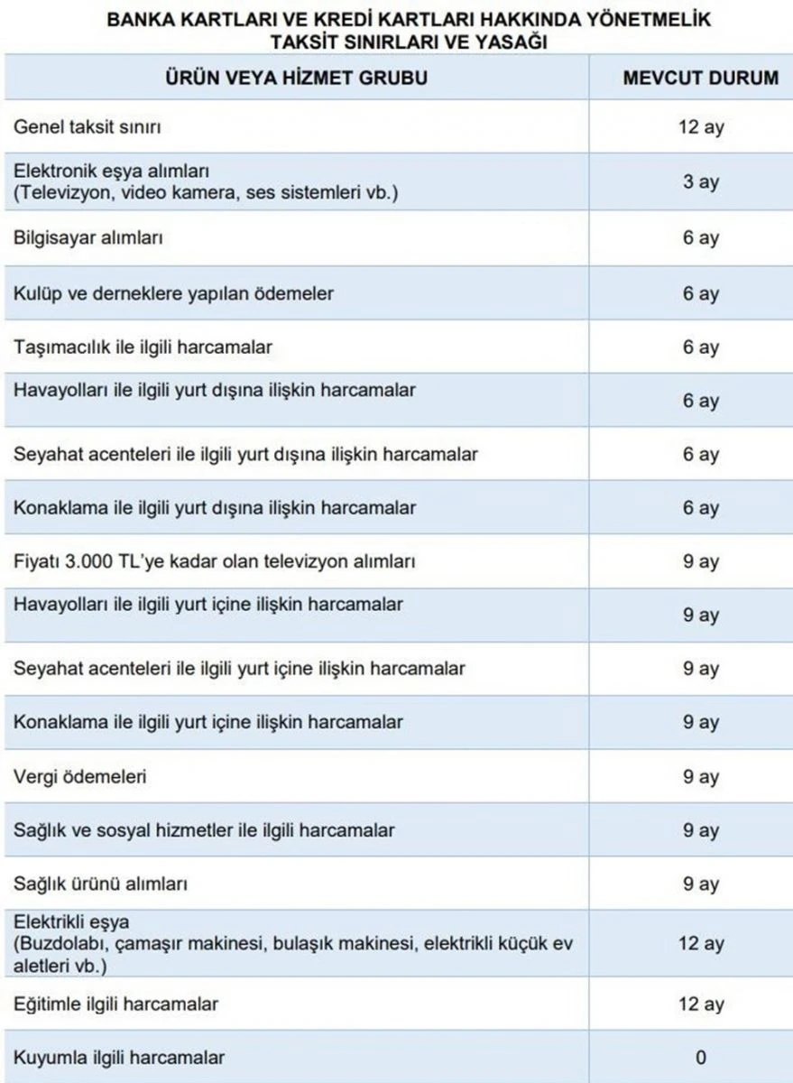 Banka kartları ve kredi kartları hakkındaki yönetmelik kapsamında, ürün veya hizmet grubuna göre taksit sınırları ve yasaklarında mevcut durum şöyle: