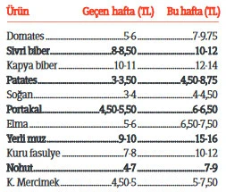 Yapılan son zamlar ile birlikte markette 30-33 lira olan bir kilogram çayın fiyatı 45 liraya kadar çıktı. Kuru gıdada yüzde 50'lere varan artış için sadece "Talep çok" diyen fırsatçılar, kırmızı mercimekte 4,5 lira olan fiyatı 7,5-8 liraya, kuru fasulyenin fiyatını da 7 liradan 10 liraya yükseltti. Bazı markalarda ise fiyatların 15-18 liraya kadar çıktığı görüldü. Domates, biber, salatalık gibi ürünlerde tarla mahsulünün çıkmasına rağmen fiyatlarda artış devam ediyor. Ramazan öncesinde 5-6 liralık salkım domates 10 liraya kadar yükselirken, sivri biberin fiyatı 12 lirayı, kapya biberin fiyatı 15 lirayı buldu.