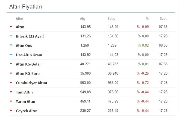Dün, dolar/TL'deki yükselişlere karşın altının ons fiyatındaki düşüşün etkisiyle 143,7 liraya kadar gerileyen altının gram fiyatı, günü önceki kapanışa göre yüzde 0,27 azalışla 143,9 liradan tamamladı.