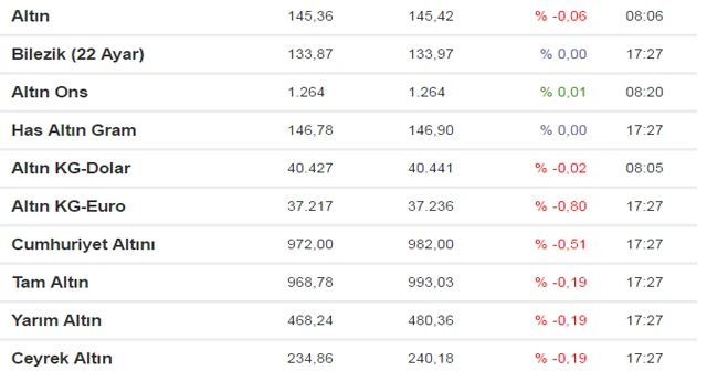 Altın fiyatları Kapalıçarşı'da düşüşüne devam ediyor. 24 ayar has altının gram fiyatı 145,40 düğün sezonunun yaklaşması ile beraber merak konusu olan çeyrek altın fiyatı ise 240 liradan işlem görüyor. İşte Kapalıçarşı'da en güncel altın fiyatları...