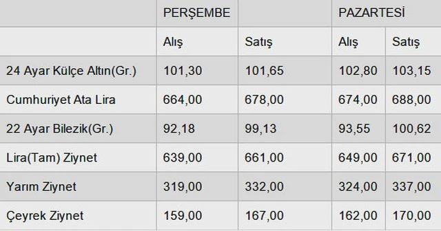 İstanbul Kapalıçarşı'da alınıp satılan altın türlerinin, önceki kapanış ve bugün açılış fiyatları (TL) şöyle: