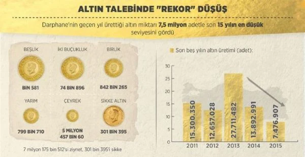Yatırımlarda halk arasında "güvenli liman" olarak görülen altın talebine yıllar itibarıyla bakıldığında, 2001 yılında 8 milyon 614 bin 797, 2002'de 9 milyon 793 bin 287, 2003'te 16 milyon 307 bin 280, 2004'te 15 milyon 896 bin 470, 2005’te 17 milyon 464 bin 39, 2006’da 17 milyon 276 bin 902 adet olmuştu.Üretim 2007 yılında 18 milyon 945 bin 616, 2008'de 16 milyon 649 bin 372, 2009 yılında 9 milyon 919 bin 599, 2010’da 11 milyon 187 bin 309, 2011’de 15 milyon 300 bin 350, 2012’de 12 milyon 657 bin 28 adeti bulurken, 2013’te 27 milyon 711 bin 482 adet ile rekor seviyeye ulaşmıştı. 2014 yılında ise üretim yarı yarıya azalarak 13 milyon 892 bin 991 adete gerilemişti.Bu şekilde bakıldığında geçen yıl altın üretimi, 2001 ekonomik krizi ile 2008'in son döneminde başlayan küresel krizin Türkiye'de etkilerinin görüldüğü 2009'da piyasaya verilen altın miktarının da gerisinde kalarak son 15 yılın en düşük seviyesine geriledi.