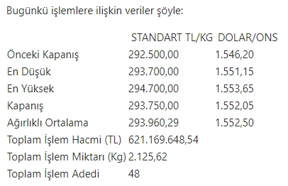 KMKTP'de, altında gerçekleşen toplam işlem hacmi 621 milyon 169 bin 648,54 lira, işlem miktarı ise 2.126 kilogram oldu. Tüm metallerdeki toplam işlem hacmi ise 621 milyon 169 bin 648,54 lira oldu.