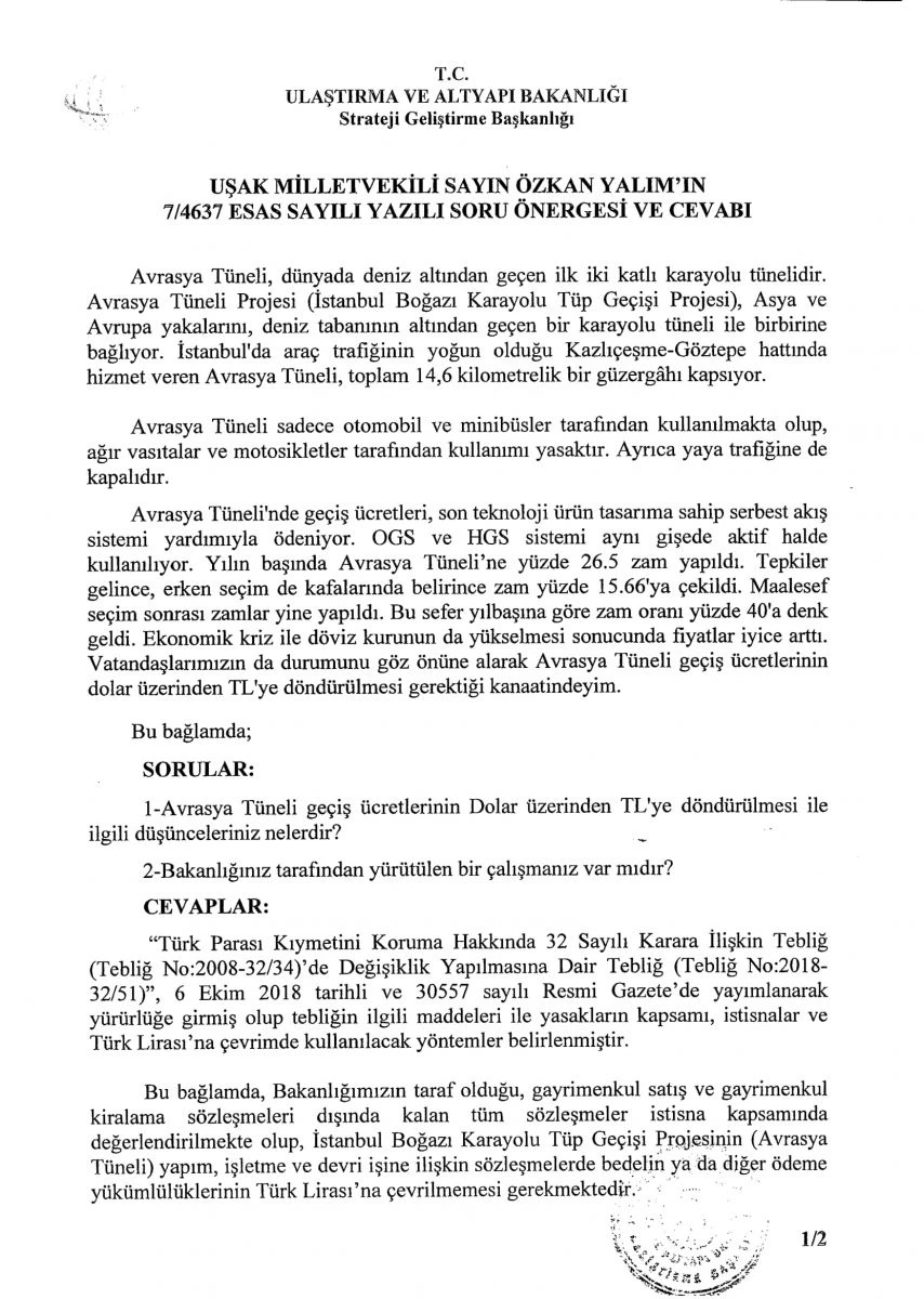 CHP Uşak Milletvekili Özkan Yalım, Avrasya Tüneli'nden geçiş ücretinin TL'ye çevrilip çevrilmeyeceğini TBMM gündemine taşıyıp, Ulaştırma ve Altyapı Bakanı Cahit Turhan'ın cevaplaması istemiyle soru önergesi verdi.