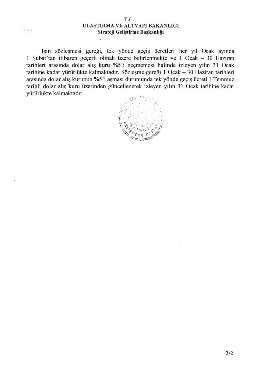 Özkan Yalım'ın “Avrasya Tüneli geçiş ücretlerinin dolar üzerinden TL’ye döndürülmesi ile ilgili düşünceleriniz nelerdir? Bakanlığınız tarafından yürütülen bir çalışmanız var mıdır?” sorusuna Bakan Turhan, “Türk Parası Kıymetini Koruma Hakkında 32 Sayılı Karara İlişkin Tebliğ’in ilgili maddeleri ile yasakların kapsamı, istisnalar ve TL’ye çevrimde kullanılacak yöntemler belirlenmiştir. Bu bağlamda, Avrasya Tüneli yapım, işletme ve devri işine ilişkin sözleşmelerde bedelin ya da diğer ödeme yükümlülüklerinin TL’ye çevrilmemesi gerekmektedir.” cevabını verdi.