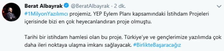 Bakan Albayrak, 1 Milyon Yazılımcı projesine ilişkin şu bilgileri verdi: