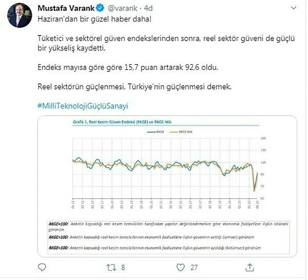 Sanayi ve Teknoloji Bakanı Varank, sosyal paylaşım sitesi Twitter'daki hesabından yaptığı açıklamada, "Haziran'dan bir güzel haber daha. Tüketici ve sektörel güven endekslerinden sonra, reel sektör güveni de güçlü bir yükseliş kaydetti. Endeks mayısa göre göre 15,7 puan artarak 92,6 oldu. Reel sektörün güçlenmesi, Türkiye'nin güçlenmesi demek" dedi.