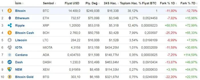 Bitcoin fiyatları ne kadar oldu? Dünyanın en büyük kripto sanal parası Bitcoin hakkındaki haberler gün geçtikçe artıyor. İşte Bitcoin hakkında son fiyat bilgisi... Bitcoin, dün gece ABD piyasasında 14 bin doların altına kadar geriledi. Bugün ise 13 bin doların altında işlem görüyor. Bir hafta kadar önce 20 bin seviyesini test eden Bitcoin, bir günde 3 bin dolardan fazla kayıp yaşadı. Haftalık bazda ise yüzde 20'ye yakın geriledi. Bitcoin'in yanı sıra, Ethereum, Litecoin, IOTA, Cardano gibi para birimleri de bir gün öncesine göre düşüş yaşadı.