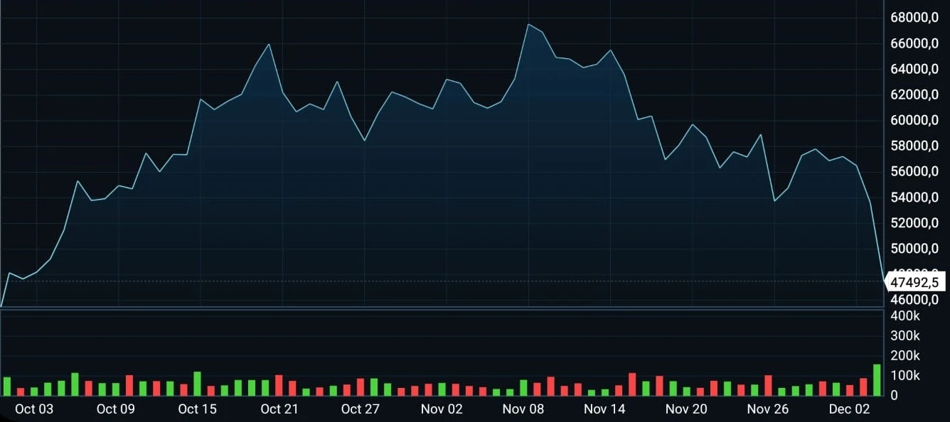Dünyanın en büyük kripto parası Bitcoin (BTC) fiyatı 10 Kasım 2021’de 68,789.63 dolarda yeni tüm zamanların en yüksek değerini kaydetmiş, ancak sonrasında sert bir düşüşle 53 bin dolar seviyelerine kadar gerilemişti. Ancak Bitcoin sert düşerek 42 bin 587 doları gördü ve piyasa değeri ilk kez 1 trilyon doların altına çekildi. Bitcoin an itibariyle, Bitcoin (BTC) yüzde 16 değer kaybederek 47 bin 903 dolardan işlem görüyor