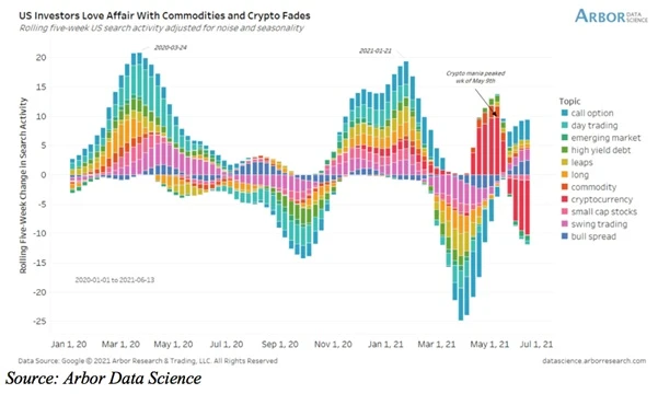 Arbor Data Science verilerine göre Amerikalıların kripto paralara karşı öncelere göre daha ilgisiz olduğu kaydedildi. Şu anda ise yüksek riskli opsiyon ticareti stratejileri aradıkları ifade edildi. ABD’de ‘kripto’ terimiyle ilişkili aramalarda düşüş yaşandı. Menkul kıymete yönelen yatırımcı ‘call option’ ve ‘Bull spread’ gibi terimleri aratarak alternatif arayışına girmiş durumda.