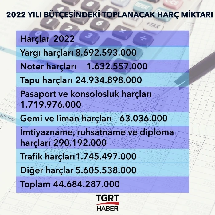 2022 Yılı Merkezi Yönetim Bütçe Kanun Teklifi verilerine göre devletin, ticaret sicil harçlarından 617 milyon 131 bin lira, esnaf sicil harçlarından 127 milyon 791 bin lira, diğer yargı harçlarından da 7 milyar 947 milyon 671 bin lira olmak üzere, yargı harçlarından toplam 8 milyar 692 milyon 593 bin lira tahsilat yapması hedefleniyor.