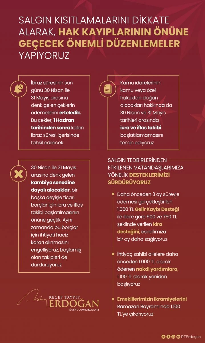 Cumhurbaşkanı Erdoğan, Twitter hesabından yaptığı paylaşımda, "Salgın kısıtlamalarını dikkate alarak, hak kayıplarının önüne geçecek önemli düzenlemeler yapıyoruz." ifadeleriyle, şu bilgilere yer verdi:
