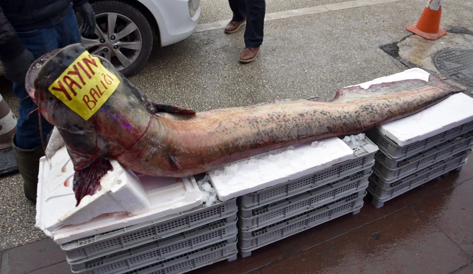 Kastamonu’da balıkçılar, Kızılırmak üzerinde gece vakti zıpkınla yayın balığı yakaladı. Yakalanan dev yayın balığı balıkçılar tarafından tezgaha konuldu. 2 metre uzunluğunda ve 40 kilo ağırlığındaki yayın balığını görenler ise şaşkınlık yaşadı. Dev balık, kilogramı 50 liradan satıldı.