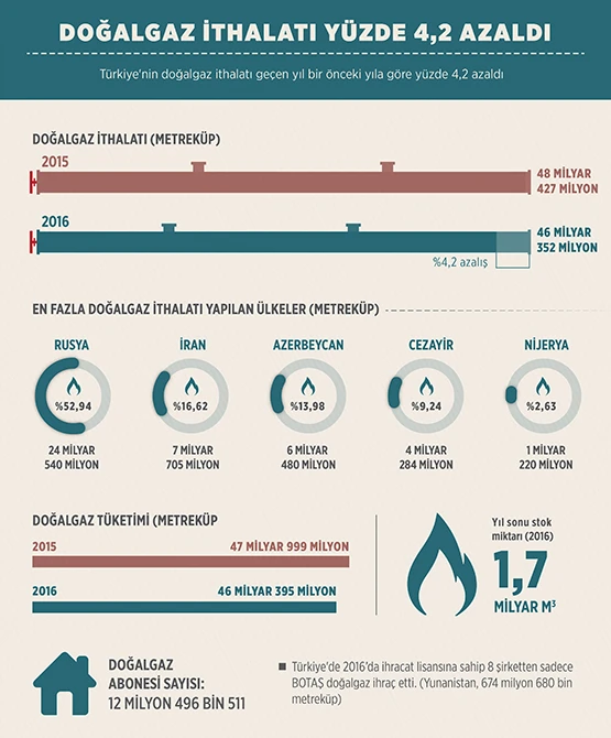Rapora göre, Türkiye'nin 2016 yılında 49 milyar 562 milyon metreküp doğalgaz tüketeceği öngörülmüştü. Bu miktar yıl sonu itibarıyla yüzde 6,4 azalarak 46 milyar 395 milyon metreküp olarak gerçekleşti.
