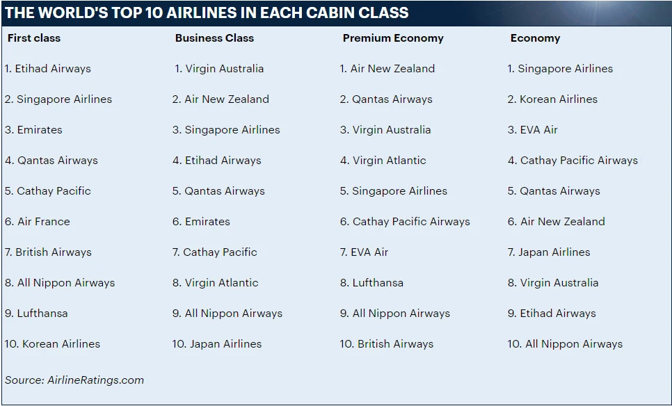 Avrupa'nın üst üste en iyi havayolu ödülünü alan THY listeye giremedi. Listede en iyi first class sıralamasında Etihad zirveye otururken onu Singapur ve Emirates Havayolları takip etti.