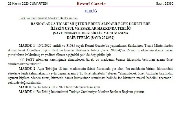 TCMB'nin Finansal Tüketicilerden Alınacak Ücretlere İlişkin Usûl ve Esaslar Hakkında Tebliğ'de Değişiklik Yapılmasına Dair Tebliğ'i ile Bankalarca Ticari Müşterilerden Alınabilecek Ücretlere İlişkin Usul ve Esaslar Hakkında Tebliğ'de Değişiklik Yapılmasına Dair Tebliğ'i Resmi Gazete'de yayımlandı.