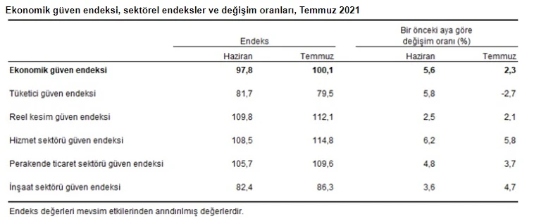 Türkiye İstatistik Kurumu (TÜİK) tarafından açıklanan Temmuz ayı Ekonomik Güven Endeksi verilerine göre, ekonomik güven Haziran ayında 97,8 iken, Temmuz ayında yüzde 2,3 oranında artarak 100,1 değerine yükseldi. Ekonomik güven endeksindeki artış, reel kesim (imalat sanayi), hizmet, perakende ticaret ve inşaat sektörü güven endekslerindeki artışlardan kaynaklandı.