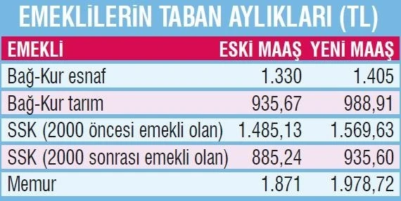 Yüzde 5.69'luk zam ile memur emeklilerinin taban maaşı 2 bin liraya dayandı. Aralık'ta bin 871 lira olan en düşük memur emeklisi maaşı bin 978 lira 72 kuruşa çıktı. Bağ-Kur esnaf emeklilerinde de en düşük maaş bin 330 liradan bin 405 liraya yükseldi. Türkiye Emekliler Derneği verilerine göre; taban maaşlar 2000'den önce emekli olan SSK'lılarda bin 485 lira 13 kuruştan bin 569 lira 63 kuruşa, 2000'den sonra emekli olan SSK'lılarda 885 lira 24 kuruştan 935 lira 60 kuruşa, Bağ-Kur tarım emeklilerinde 935 lira 67 kuruştan 988 lira 91 kuruşa ulaştı. SSK ve Bağ-Kur emeklilerinde en yüksek maaş ise 4 bin 240 liradan 4 bin 481 liraya çıktı.
