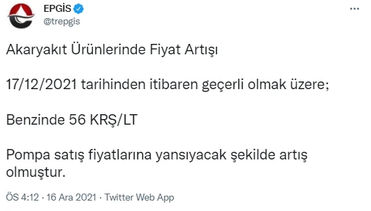 EPGİS, sosyal medya platformu Twitter üzerinden yapılan açıklamada, 17 Aralık tarihinden itibaren geçerli olmak üzere benzine zam yapıldığı bildirildi.
