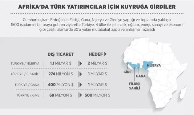 Cumhurbaşkanı Recep Tayyip Erdoğan Şubat ayının başında, Şili, Peru ve Ekvator'u kapsayan Güney Amerika seyahatine çıkmış ve Türk iş adamları bölgeye davet edilmişti. Erdoğan'ın başında bulunduğu heyet bu kez Afrika'ya çıkarma yaptı ve buradan 30'a yakın mutabakat zaptı ve anlaşma imzaladı.Cumhurbaşkanı Erdoğan, bin 500 kişilik heyetle Fildişi, Sahilleri, Gine, Nijerya ve Gana'ya seyahat etti. 28 Şubat - 4 Mart arasındaki ziyaretlerde birçok görüşme ve anlaşma yapıldı.