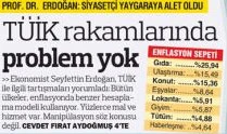 Erdoğan “Tüketim içerisinde onlarca, yüzlerce mal ve hizmet var. Bu mal ve hizmetlerin bir kısmı çok ciddi fiyat artışlarına konu olur, bir kısmı da daha tolere edilebilir fiyat artışlarına konu edilir. Fiyatı çok artanlar ile daha az artanların ortalaması alındığında, makul bir rakam ortaya çıkar. Bütün dünyada böyledir. Enflasyonla ilgili hesaplamalardaki rakamlara bakıldığında yapılan budur. Gıda ürünlerinin fiyatlarındaki artış çok yüksek seyredebilir ama tüketicinin aylık harcamaları içerisinde bütün harcamaları gıda değildir. Bütün kalemleri dikkate aldığınızda TÜİK’in ilan ettiği enflasyon oranı söz konusu. TÜİK rakamlarında herhangi bir manipülasyon veya yanlış yönlendirme yok” dedi.