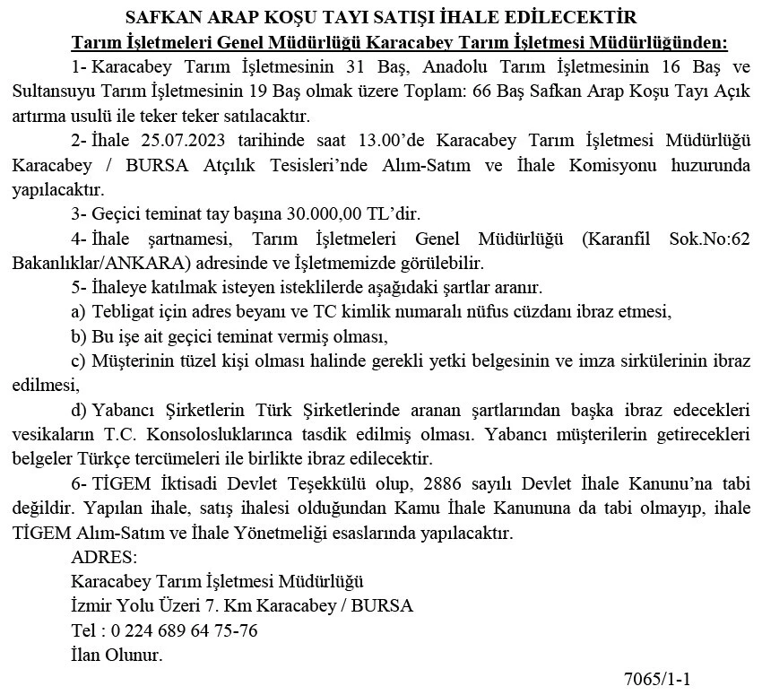 Atçılık camiasının beğenisine sunulacak tayların satış ihalesi 25 Temmuz saat 13.00'da Bursa Karacabey Tarım İşletmesi’nde gerçekleşecek.