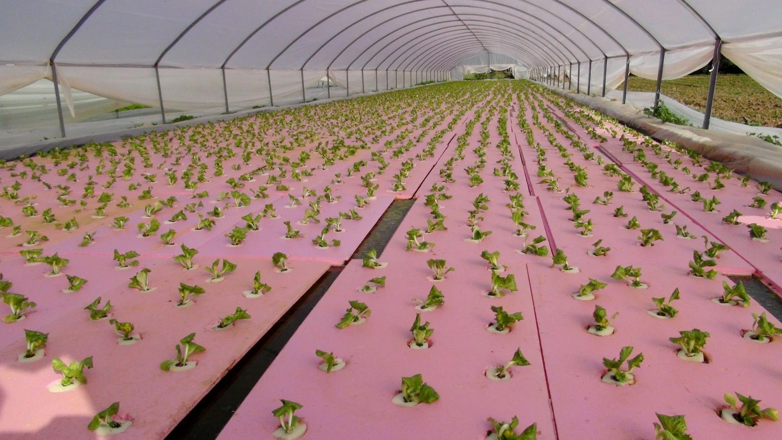 Seraların içerisine 20-30 santimetre derinliğinde oluşturan havuzların üstünde yüzen süngerlerin üzerine dikilen marullar, 30-35 gün içinde hasat noktasına ulaşıyor.