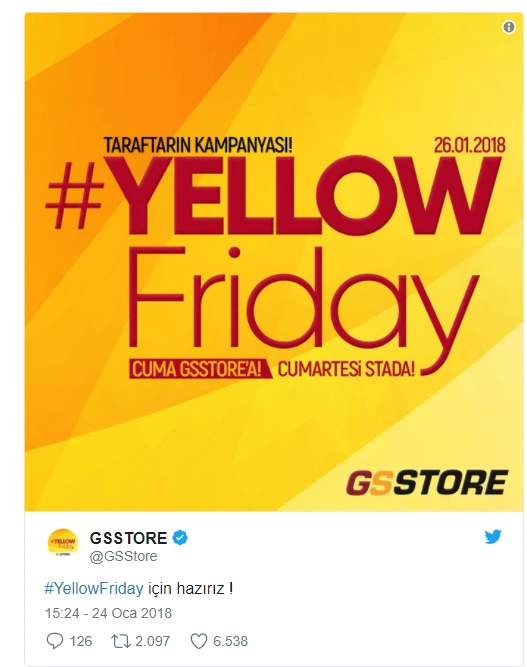 Galatasaray’da yeni başkan seçilen Mustafa Cengiz, zafer sonrasında taraftarlarına çağrıda bulunarak kulübe maddi destek olmalarını istemişti. Başkanlarının yaptığı çağrıya kulak veren taraftar Amerika’da her sene yapılan Black Friday’den ilham alarak Yellow Friday kampanyasını başlattı. Galatasaray taraftarının yeni başkanı Mustafa Cengiz’in başkanlık seçimlerinde sarı oy pusulasını kullanması nedeniyle Yellow Friday adını verdikleri kampanyada GS Store’daki stokları bitirmeyi amaçlıyor.