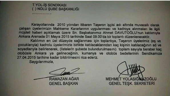 Yol-İş Sendikası şubelere gönderdiği bir yazıylaa, 1 Mayıs günü kadroyla ilgili “müjde” verileceğini belirterek, tüm üyelerini Başbakan Davutoğlu’nun katılacağı toplantıya davet etti. Sendikadan şubelere gönderilen yazıda Yol-İş Genel Başkanı Ramazan Ağar ve Genel Teşkilatlandırma Sekreteri Mehmet Yolasığmazoğlu'nun imzaları yer aldı.