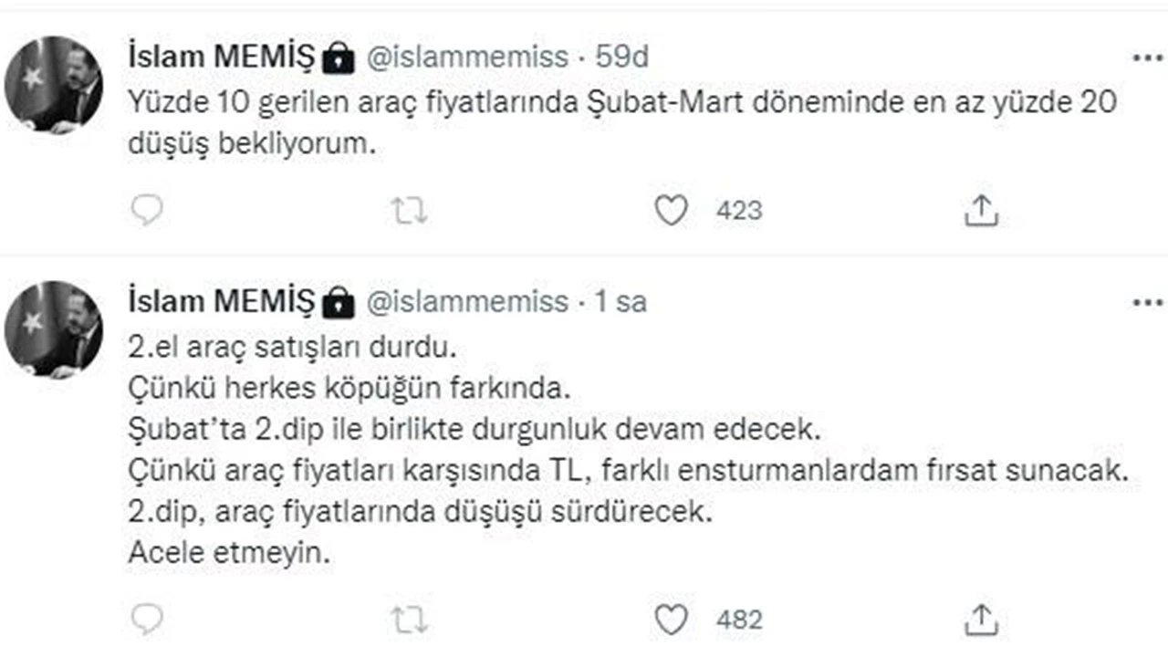 Konu ile ilgili sosyal medya hesabından açıklamalarda bulunan Altın ve Para Piyasaları Uzmanı İslam Memiş, ikinci el araç alacaklara 'acele etmeyin' uyarısında bulunarak "2.el araç satışları durdu. Çünkü herkes köpüğün farkında. Şubat’ta 2.dip ile birlikte durgunluk devam edecek. Çünkü araç fiyatları karşısında TL, farklı enstrümanlardan fırsat sunacak. 2.dip, araç fiyatlarında düşüşü sürdürecek. Acele etmeyin. Yüzde 10 gerilen araç fiyatlarında Şubat-Mart döneminde en az yüzde 20 düşüş bekliyorum. Dolar kaynaklı iki sebep; 1- 18’den 10’a gerilediğinde $ zarar edenler bozdurup araç alamadı. 2- 2.dip geldiğinde aracı değil $ cazip görecekler. Mevsimsel etki ve köpük fiyat buna dahil olunca yüzde 20’lik düşüş kaçınılmaz bana göre. Yok diyen varsa araç bol, buyursun alsın." dedi.