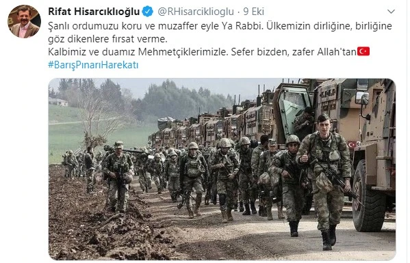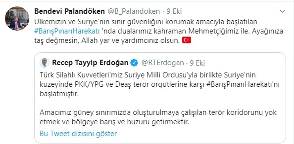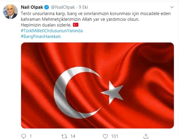 TESK Başkanı Bendevi Palandöken de mesajında “Ülkemizin ve Suriye'nin sınır güvenliğini korumak amacıyla başlatılan #BarışPınarıHarekatı 'nda dualarımız kahraman Mehmetçiğimiz ile. Ayağınıza taş değmesin, Allah yar ve yardımcınız olsun” dedi.