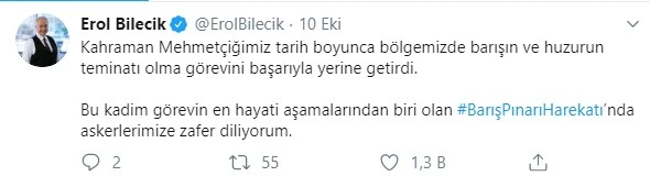 İş adamı Erol Bilecik de harekata destek veren isimler arasında yer aldı. Bilecik mesajında “Kahraman Mehmetçiğimiz tarih boyunca bölgemizde barışın ve huzurun teminatı olma görevini başarıyla yerine getirdi. Bu kadim görevin en hayati aşamalarından biri olan #BarışPınarıHarekatı’nda askerlerimize zafer diliyorum” ifadelerini kullandı.