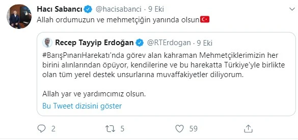 Hacı Sabancı, Cumhurbaşkanı Recep Tayyip Erdoğan’ın paylaşımını alıntılayarak “Allah ordumuzun ve Mehmetçiğin yanında olsun” mesajını yayınladı.
